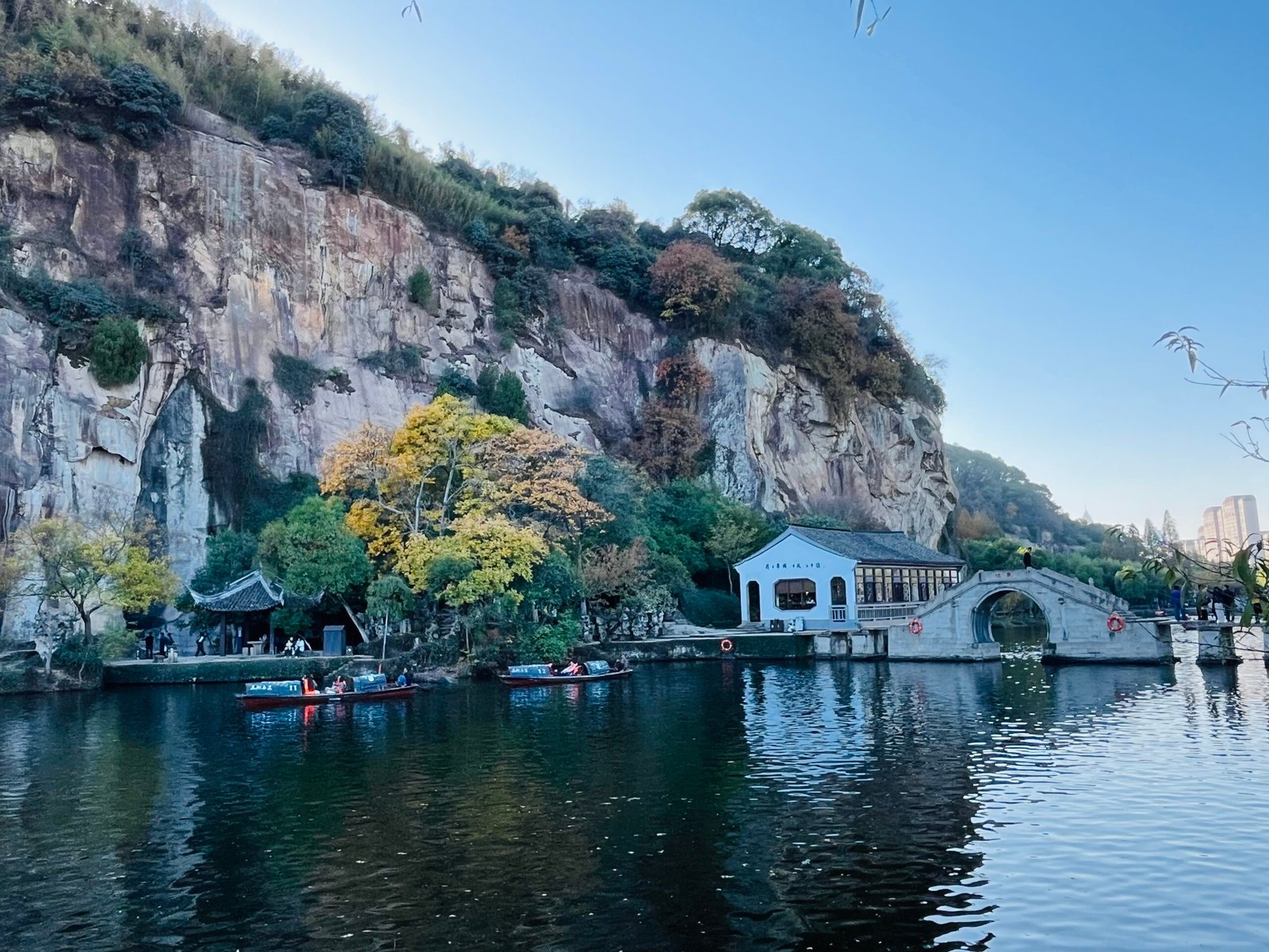 东湖最典型的游览方式,是乘乌篷船入湖。船行其间,水道狭窄,转折频繁,岩壁倒映水中,几乎贴面而来。人在船上,无法居高临下地“看风景”,只能被动地进入风景之中。这种体验,让东湖多了几分近乎压迫的沉浸感。